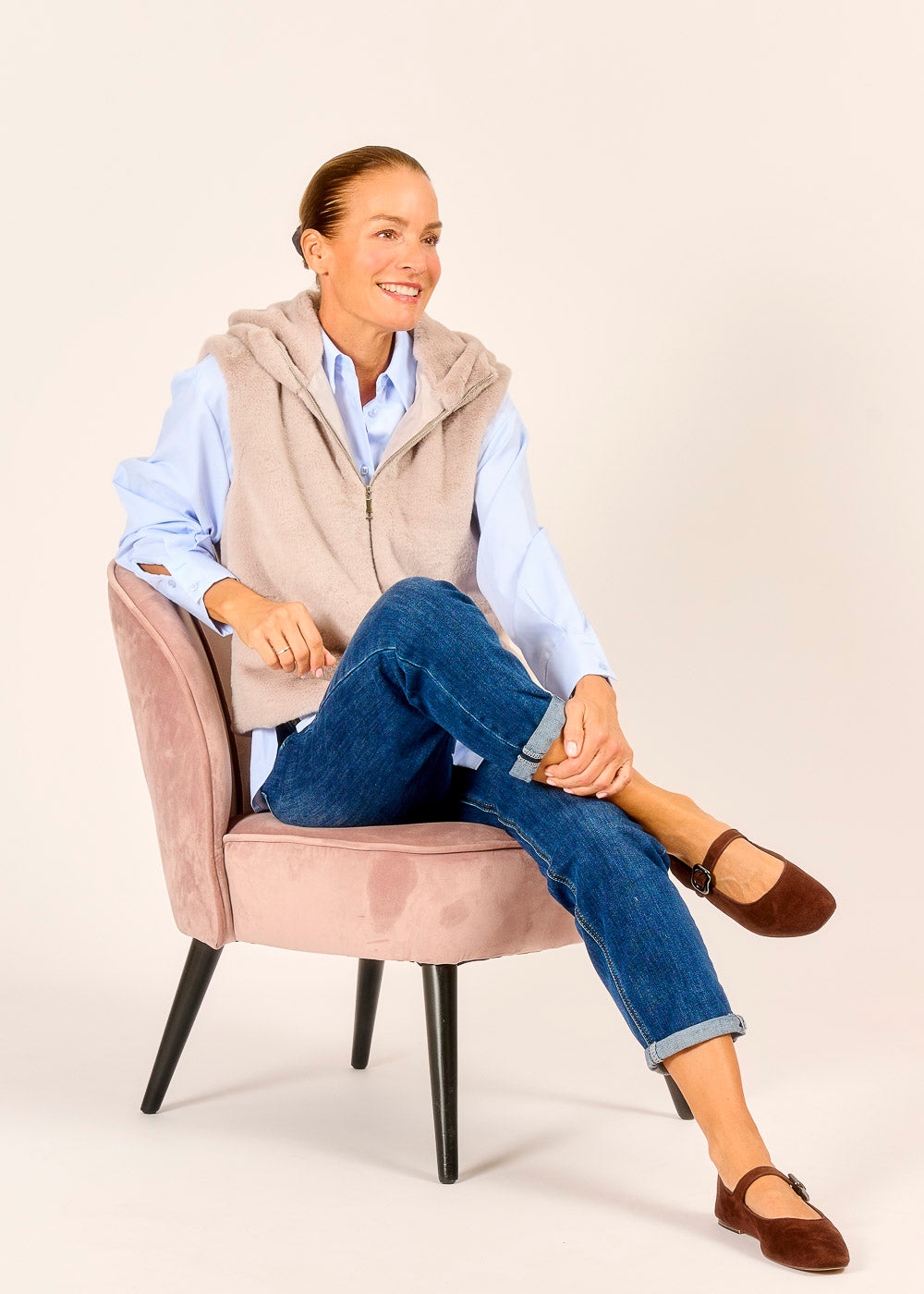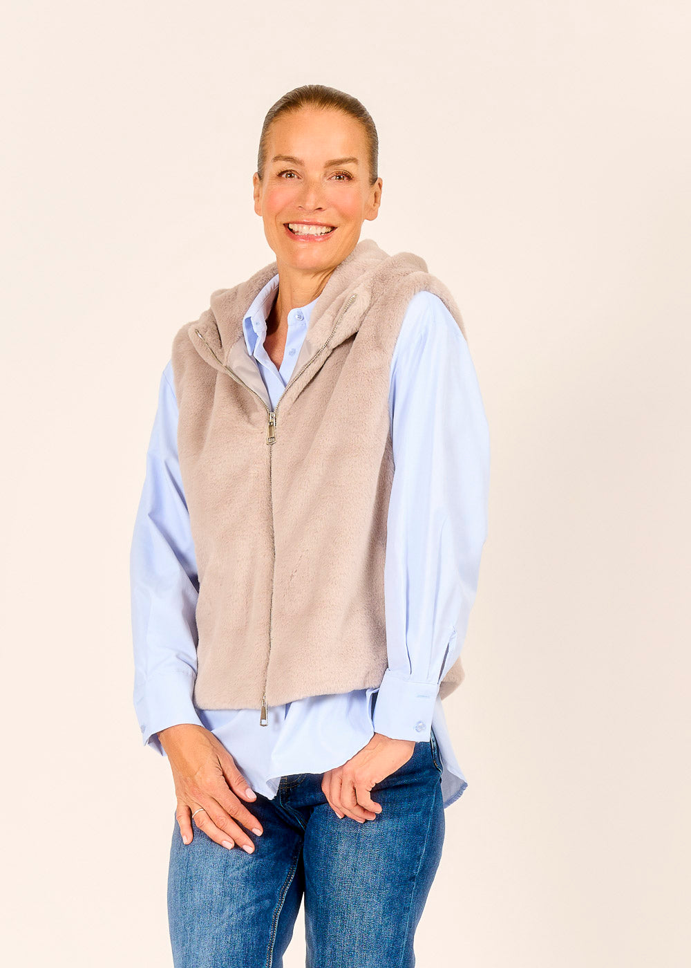 Grigiofarbenes Kunstfell umhüllt Sie wie eine sanfte Wolke aus Luxus und sorgt für einen Hauch zeitloser Eleganz. Die Kapuze verleiht dem Look eine moderne, lässige Note, während die klare Silhouette die perfekte Alternative zum klassischen Blazer bietet. Ob drinnen beim Meeting oder draußen beim Stadtbummel – diese Weste macht jedes Outfit sofort besonders. Ein Statement-Piece voller Stil, Komfort und selbstbewusster Raffinesse, das Sie nicht mehr missen möchten.