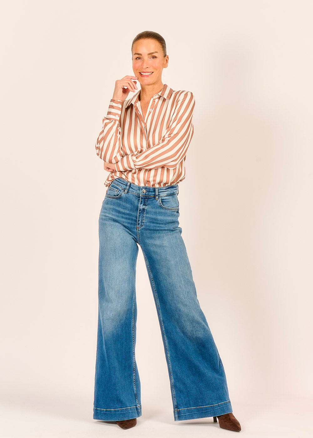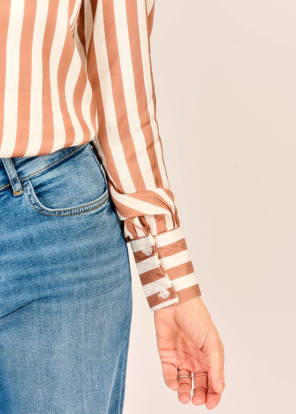 Feinste, fließende Viskose bildet die Basis für diese edle Streifenbluse und sorgt für einen eleganten Fall sowie ein luxuriöses Tragegefühl auf der Haut. Das Design überzeugt durch stilvolle Details wie die breiten Streifen, die saubere verdeckte Knopfleiste, den kleinen Kragen und die besonders hohen Manschetten an den Ärmeln. Mit diesem zeitlosen Key-Piece gelingt Ihnen mühelos ein professioneller und gleichzeitig modischer Look, der in keinem Kleiderschrank fehlen sollte.
